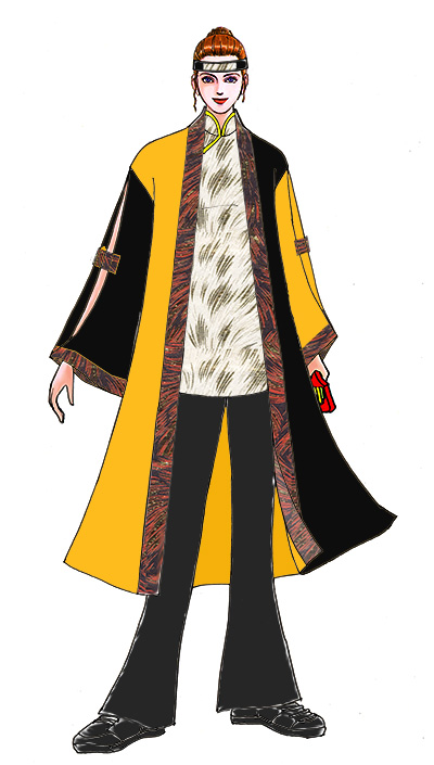半天の袖の中央を開けて、変化を出しています。 インナーのチャイナシャツとのバランスを考えました。 よさこいの半天らしく織物生地でポイントをつけて 動きが目立つような半天にしました。