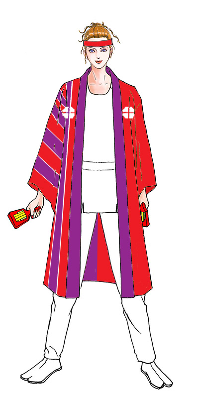 基本的な半天の形ですが、女性だけのチームなので、赤と紫という女性らしい配色にしています。