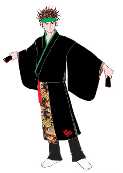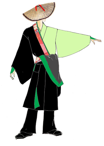 黒のチリメンと鮮やかな和柄のチリメンのコントラストが特徴です。 緑色の伊達衿や手甲でアクセットをつけています。 シルバーの帯が粋な衣装です。 インナーには、黄緑の小袖を着てさわやかなコントラストとお祭りの雰囲気を出しています。