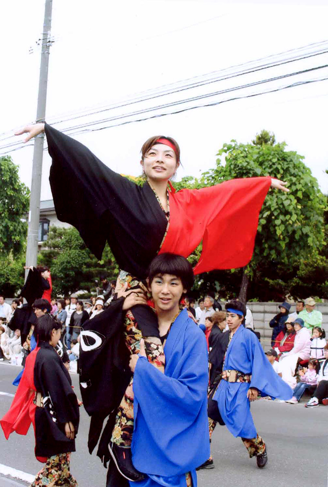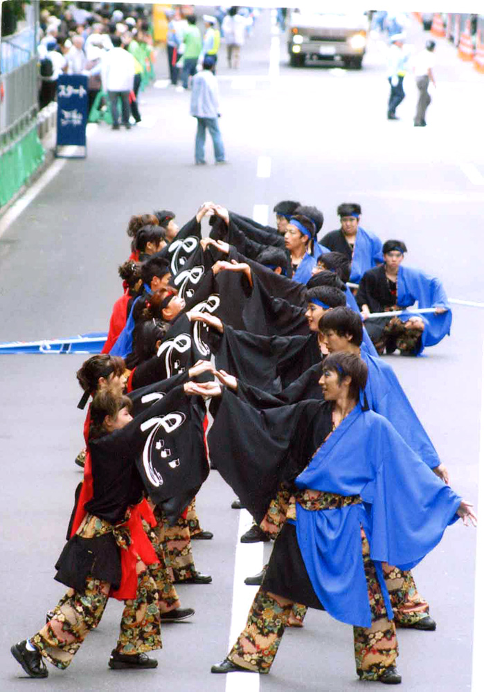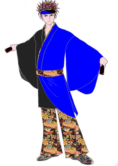 女性、男性と別配色で全体のフォーメーションが映える衣装です。 パンツと帯に柄生地を使用した事で着物の無地が映えています。 着物の形ではありますが、上前にドレープを加えてラインに特徴を持たせました。 袖の形も動きを出すために前と後ろの形を変えました。
