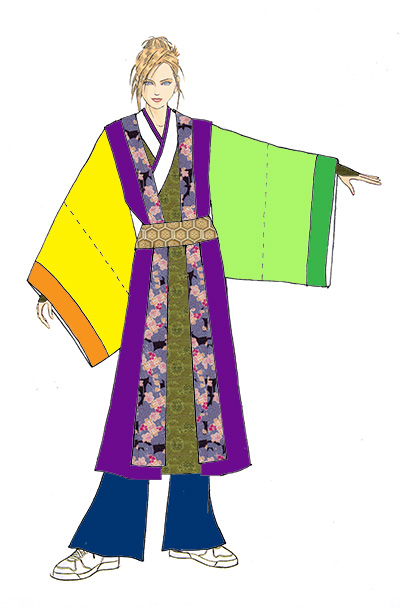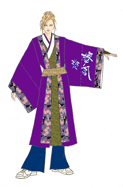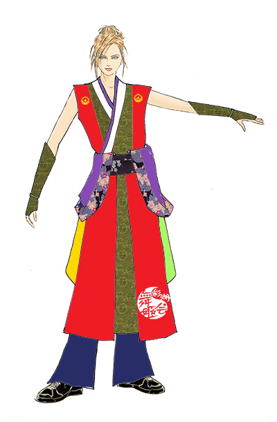 着物の形をメインに、重ね着をしているよう作り込んだ衣装です。 早変えは、袖の変化ですが大胆な配色により大きくイメージが変わって見えます。 3回目の早変えは、スッキリと全体が赤に見え1枚目の衣装も邪魔にならない収納をしています。