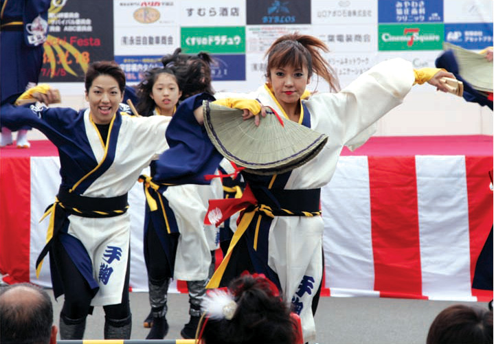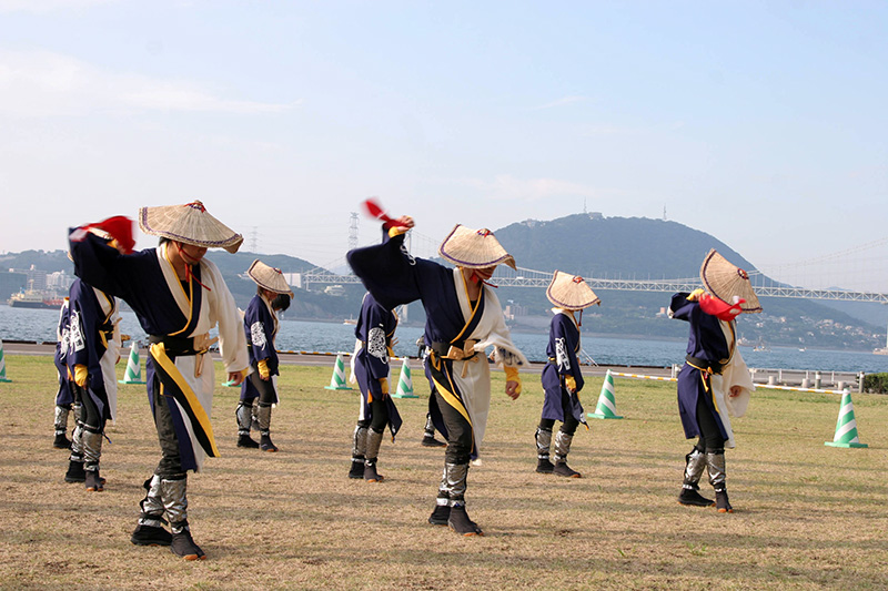 黄色の伊達衿や手甲がポイント色で紺色を引き立てています。