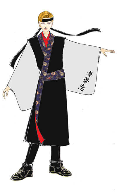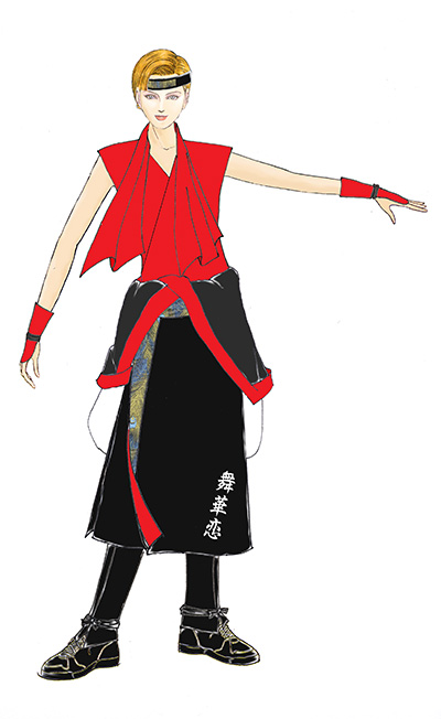 袖なしの半天を上から着ているように見えて上半身を脱ぐと、真っ赤なブラウスになります。